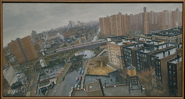 This painting was executed from the corridor window outside of the apartment of the poet and art critic David Shapiro, during the winters of 1981–82 and 1982–83. According to the artist, he placed his easel to the right of the window "which accounts for some of the extreme tilting effect on the left of the painting." This panoramic scene "was originally chosen because it was a good spot to work in cold and wet weather, but also provided a vantage point onto a highly diverse group of buildings and structures evocative of many aspects of city life ... The title is intended to be geographically specific, so that all elements of the scene may be easily identifiable." Downes noted that soon after this picture, he stopped painting bird's eye views and considered this work to be "one of the more poignant urban views I've done."
