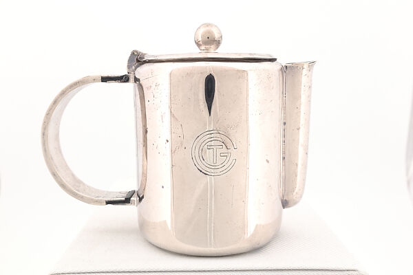 The tableware for the first-class dining room of the ocean liner Normandie included extensive silver, glass, and porcelain services that were at once elegant and sturdy. Most pieces were marked with the concentric monogram CGT, the initials of the Compagnie Générale Transatlantique which owned the Normandie. The reductive, geometric simplicity of Luc Lanel's silver-plated Transat service (made by Christofle) is recalled by its name, an abbreviation of the French "transatlantique" and a nickname for the C.G.T.
