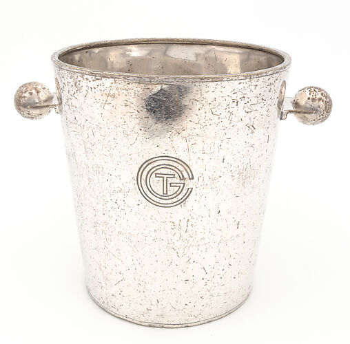 The tableware for the first-class dining room of the ocean liner Normandie included extensive silver, glass, and porcelain services that were at once elegant and sturdy. Most pieces were marked with the concentric monogram CGT, the initials of the Compagnie Générale Transatlantique which owned the Normandie. The reductive, geometric simplicity of Luc Lanel's silver-plated Transat service (made by Christofle) is recalled by its name, an abbreviation of the French "transatlantique" and a nickname for the C.G.T.
