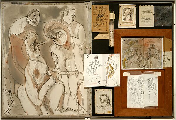 - Medium: Brush and pen and black inks, watercolor, colored pencil, marker, and graphite on various papers and books on boards, metal paper covered tube, etching plate, and wood frame with nails, tacks, a metal clip, and a purple ribbon, mounted in an open portfolio case