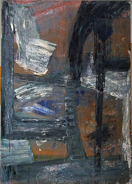 Created two decades into her long career, Grand Slam, a possible reference to either the sport of tennis or to the artist’s own athleticism, is indicative of Fishman’s work from the mid-1980s. The work comprises successive layers of paint that are alternately applied and removed, added and subtracted, resulting in a rich, variegated, tactile surface. Its composition consists of a patchwork of interlocking brushstrokes, some long and sweeping, others relatively short and staccato, as in the center of the canvas, where a stack of horizontal marks resides, the product of the artist pulling an implement, perhaps a narrow palette knife, across and through wet paint. As they do here, traces of the artist’s labor and the movement of her arm across the canvas remain visible throughout, a nod, perhaps, to Fishman’s study of Italian Old Master painting, whose physicality drew her attention.[1] The artist’s palette tends towards somber tones: browns, blacks, and grays brightened with occasional passages of white, blue, and green. A sense of drama and theatricality pervades the painting, thanks to the collision of multi-directional strokes.