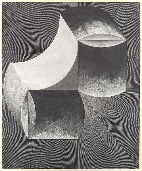In addition to his many multimedia box sculptures, Samaras made drawings of imaginary boxes. In this drawing from 1966, he reserved the blank sheet to silhouette the box shape and used precisely etched lines in graphite to suggest deep space.