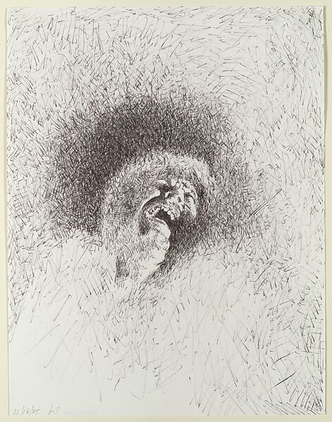 The artist once said, "Because I was Greek, I could deal with the body freely. Consider the Greek Vases." In 1985, Samaras began a series of expressive self-portraits in ink based on his own photographs. This drawing depicts the artist crying out in anguish, while another in the series (MMA 1986.416.47) juxtaposes his stoic face next to that of the dying mythical Greek giant Alkyoneus, copied from the frieze of the Pergamon Altar (ca. 200–150 b.c.). Samaras created these so-called Dot Drawings by placing photographs on top of a light box and stippling over them on a second sheet of paper in ink.