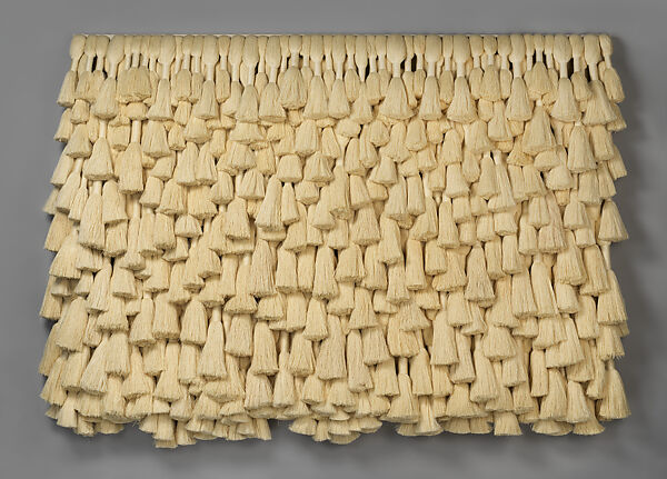 Sheila Hicks conceived this work after a winter trip to Normandy, France. She successfully recreated the effect of snow piled high on the rooftops by overlapping layers of tassels made from bleached linen thread to produce a luxuriantly thick, soft-white relief.
