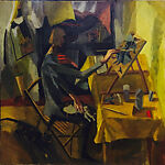 According to the artist, this painting was executed in Falmouth, Cornwall in October 1984. It is one of a series of three paintings depicting self-portraits in the kitchen. Mabbutt wrote: "The basis of my work is a focusing on particular moments which occur in my personal life. These are [found] in the commonplace. Walking on the beach, brushing my daughter's hair at the kitchen table, trying on shoes. They are moments of heightened consciousness—an awareness of what it is to be living at the moment. The paintings develop through a number of small studies and researches of the information from the situation, and attempt to develop into paintings which are celebratory of real life, but have a life of their own."