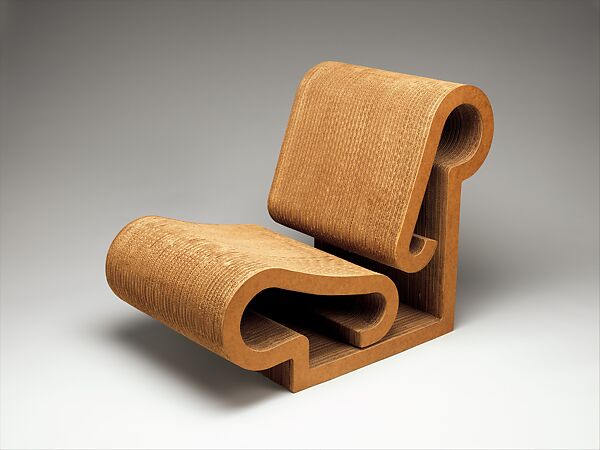 The "Contour" Chair, designed by architect Frank Gehry, transforms cardboard—one of the most prosaic and utilitarian of industrial materials—into a durable, visually dynamic, and structurally sound piece of modern design. Beginning in the late 1960s, Gehry experimented with furniture made of composite layers of cardboard, yielding objects of substantial resilience and strength, while at the same time permitting considerable flexibility of form. The "Contour" chair, for example, features a fluid, ribbonlike shape that belies its sturdy structure. Gehry was particularly interested in creating well-designed, low-cost goods, and its standardized production and inexpensive materials made "Contour" an affordable piece of furntiture. The use of common industrial supplies such as cardboard characterized much of Gehry's early architecture and design, as he sought to create a new formal vocabulary through everyday materials.