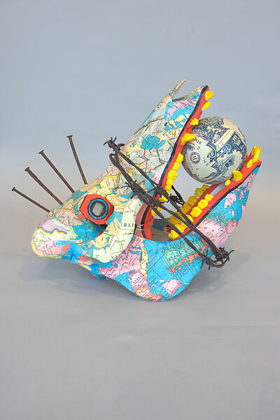In May 1984, Civilian Warfare—a small East Village gallery far from the genteel art centers of SoHo and uptown—held a solo exhibition of Wojnarowicz’s work that included a series of plaster casts, paintings, and sculptures, this example among them. A painted pig skull wrapped in segments from a map, it incorporates further references to the degraded industrialized society that the artist so vilified in the form of a timepiece in place of an eye and a globe of $100 bills gripped in the animal’s jaws. Wojnarowicz made a number of these assemblages in the mid- to late-1980s, all incorporating the same set of visual symbols. In this skull, pierced with rusted nails and wrapped in barbed wire, forcing it to forever hold a ball of money, one can read a critique of the capitalist interests and corrupt government politics that presided over the administration of then-President Reagan. Wojnarowicz’s lover, the famed photographer Peter Hujar, captured the artist holding a skull from this series in a Civilian Warfare ad. The exhibition helped to launch Wojnarowicz’s career, as it did for many artists of the New York underground.