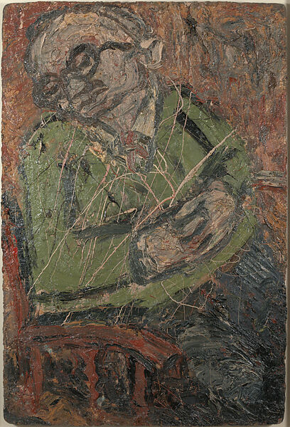 The artist’s brother Chaim, a bespectacled middle-aged man, is seen here casually dressed in a sweater and tie; he sits in a red chair, hands clasped across his stomach. His head tilts to one side, and his eyes are closed as if he were napping. The space of the composition is severely compressed, so that the figure seems to sit on the actual canvas surface. The colors of the painting are relatively dark and muted, with strong linear accents in black. This is one of the largest and most complete portraits of Chaim that Kossoff painted between 1985 and 1988, and it captures the sitter’s solid dignity and, perhaps, quiet forbearance.