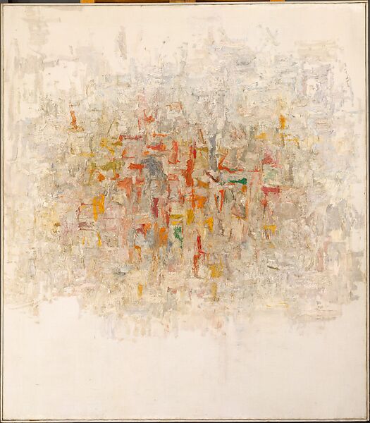 Guston made some of his most lyrical paintings in the early 1950s, including this work. He built compositions such as Painting, Number 5, seen here, using short, taut brushstrokes that coalesce at the center and disperse as they reach the margins. The resulting works appear both dense and atmospheric, like air suffused with particulate matter. Guston described them as "[v]ery heavily painted, very much overpainted and erased, covered up, repainted, so that a lot of the brush marks are simply erasures."