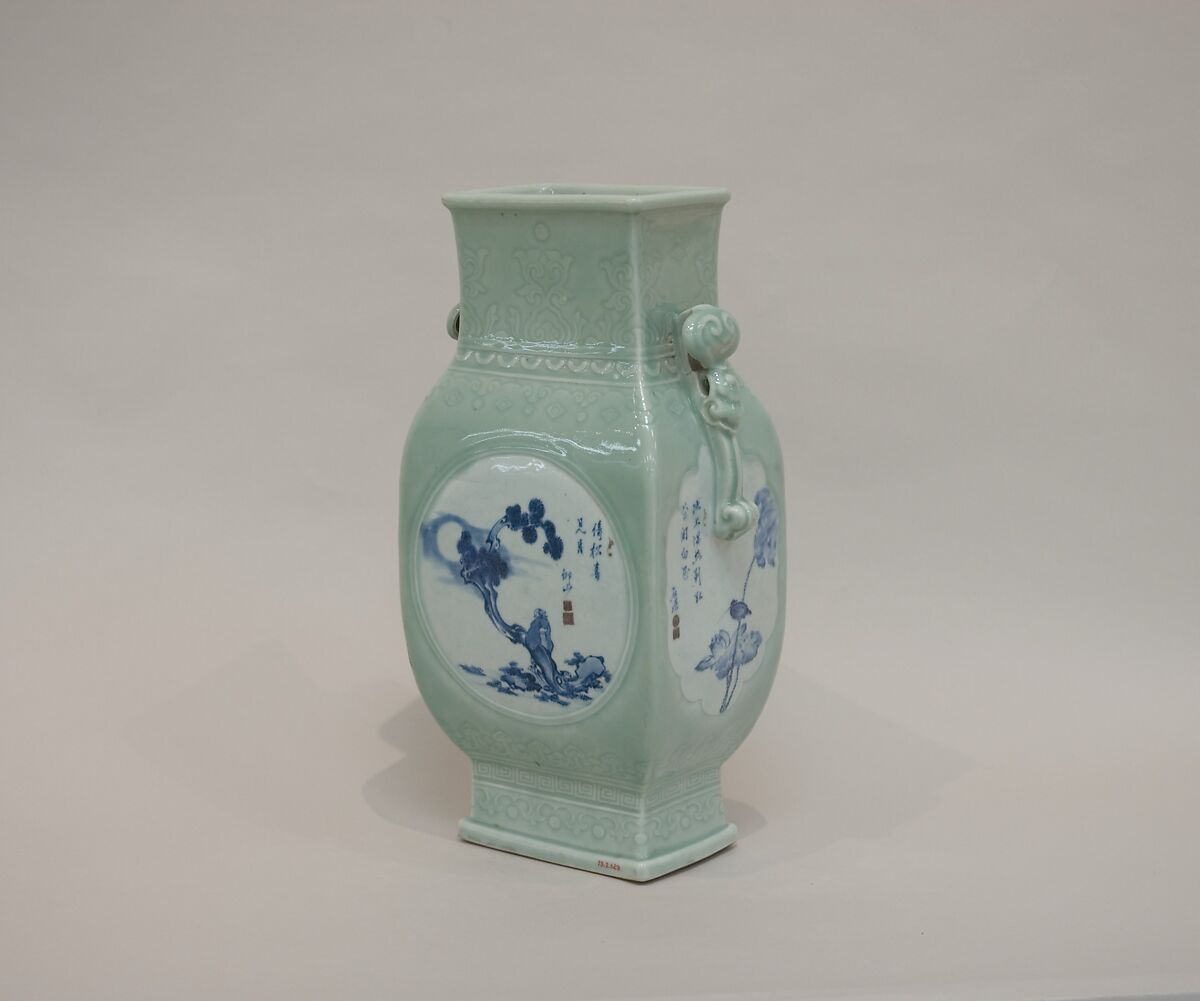 - Medium: Porcelain painted in underglaze cobalt blue and copper red, and low-relief decoration under celadon glaze (Jingdezhen ware)