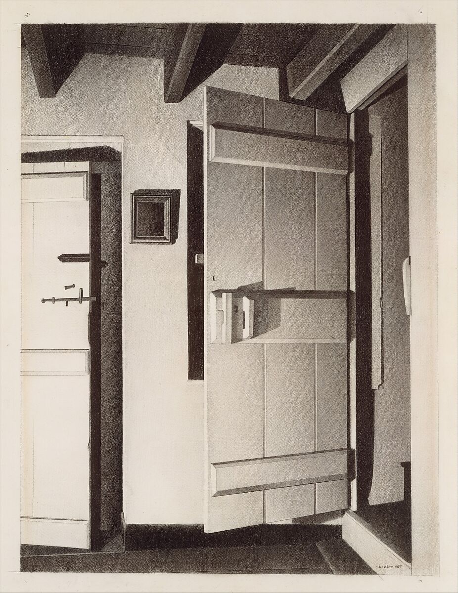 Sheeler was a versatile artist who moved easily between the media of painting, drawing, printmaking, photography, and film. For him, photography was not only a tool used to derive compositions for his paintings and drawings, but was also an independent art form that often preceded by several years his production of related paintings. In the case of The Open Door, drawn in 1932, Sheeler returned to a sequence of twelve photographs he had made about 1917 of his stone cottage in Doylestown, Pennsylvania. The house, built in 1768 by a Quaker settler, was used by Sheeler and his artist-friend Morton Schamberg as a summer and weekend studio between 1910 and 1918, when Schamberg died, and thereafter by Sheeler alone until 1926.