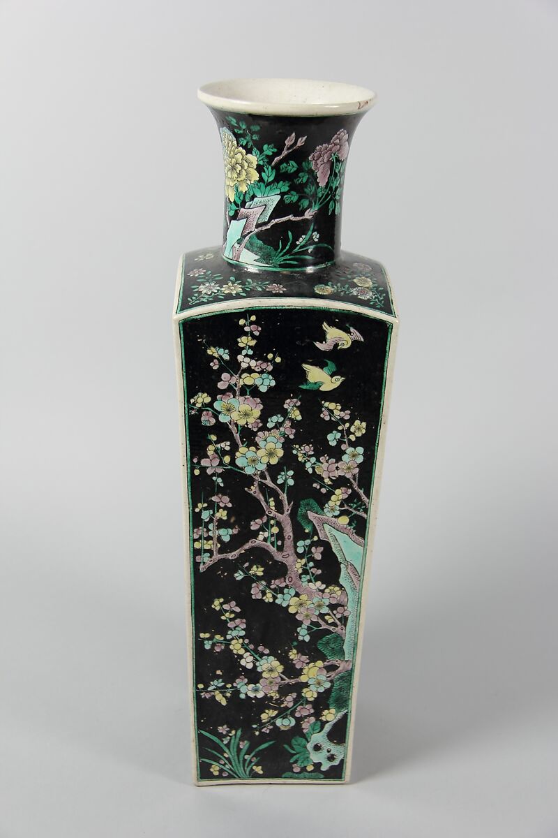- Medium: Porcelain painted in polychrome enamels over a black ground (Jingdezhen ware, famille noire)