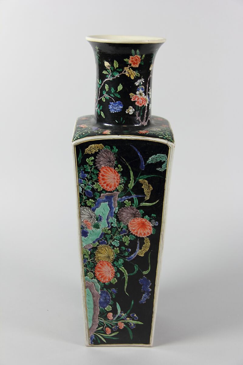 - Medium: Porcelain painted in polychrome enamels over a black ground (Jingdezhen ware, famille noire)