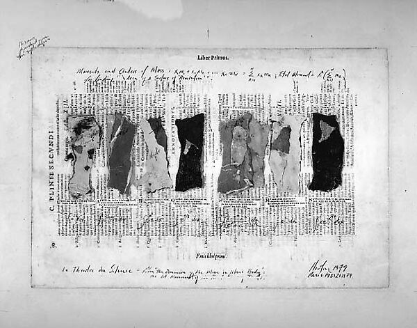 - Medium: Cut and torn pasted printed papers with selectively applied glaze and graphite on found printed paper, mounted to verso of wallpaper