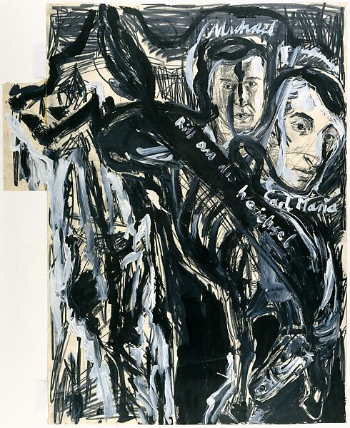 Ride to the Vistula shares its title with a 1941 book by the Silesian author Alfons Hayduk, a historian of the Vistula region who was also a member of the Nazi party; the book was banned in West Germany after the war. A plunging horse (Poland) stretches diagonally across the entire sheet, its rear leg extending the composition’s borders (and metaphorically, Germany’s or Poland’s) onto a small rectangle of paper at the upper left.