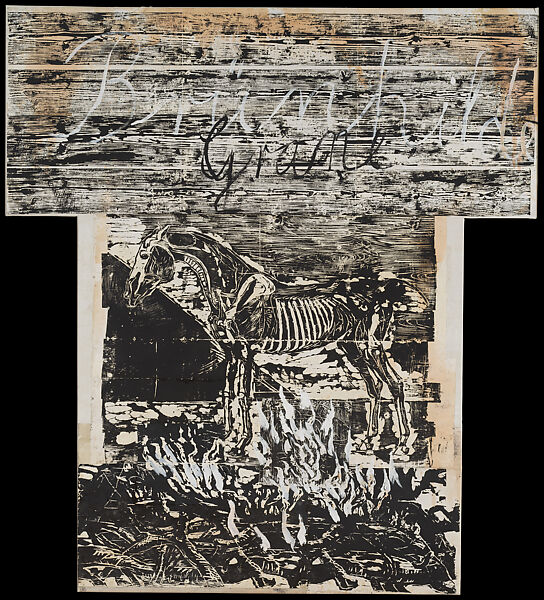 Woodcut is a traditional medium in German art, important for incunabula, Old Master images, and modern artist groups like Die Brücke (The Bridge).Kiefer began to experiment with woodblock printing in the early 1970s and returned to it in earnest in 1977–78, focusing on subjects related to German history and myth. For all the Germanic tradition evoked in his turn to the woodcut, Kiefer’s practice was nontraditional in his choice of a large format and visibly seamed composition. One of the artist’s favorite themes at this time was Grane, the sacred steed ridden by Brünnhilde when she sacrificed herself on Siegfried’s funeral pyre at the close of Wagner’s opera Götterdämmerung (Twilight of the Gods).