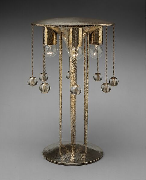 Hoffmann designed this lamp when artificial light sources were shifting from gas to electric, which challenged designers to innovate in accordance with the new technology. Rather than putting shades around the bulbs, Hoffmann left the light source exposed. The suspended glass spheres echo the bulbs’ shape and draw further attention to the new technology as they catch and reflect the electric light.