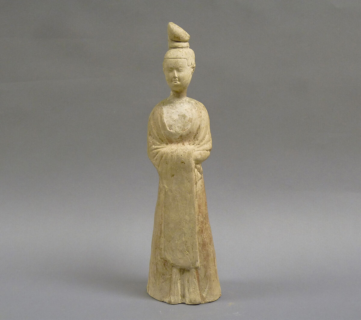 - Medium: Unglazed pottery; only b: pottery, unglazed, whitish with traces of polychrome