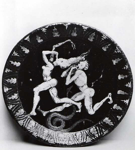 At a time when many decorative artists were mining the sources of their craft for material to transform into new, meaningful forms of expression, the archetype of the human figure continued to inspire: the elegant, active, and muscular figures of Adam and Eve—together with the acanthus-tip border—demonstrate Metthey’s interest in Hellenic pottery.