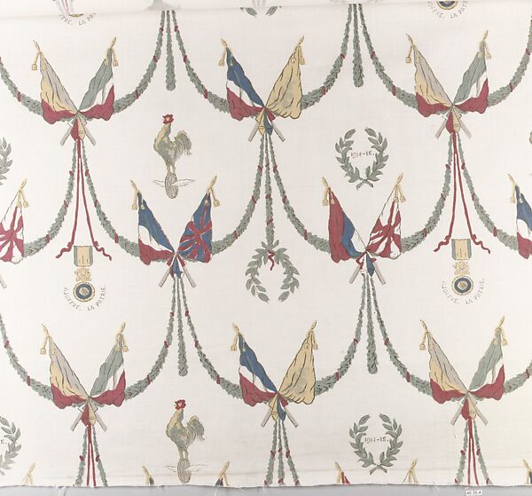 These French printed toiles, or textiles, based on traditional French printed Toiles de Jouy, were intended to boost patriotism during World War I and incorporate various nationalistic and victorious symbols with roots in ancient classicism. These motifs—wreaths and trophies of weapons for victory, the fasces for strength in numbers, Phrygian caps for freedom, cockerels for France, and Marianne (the classically dressed Athena-like figure, the personification of the French people) for reason and liberty—are rendered in a manner both up-to-date and traditional, making them topical and movingly nostalgic.