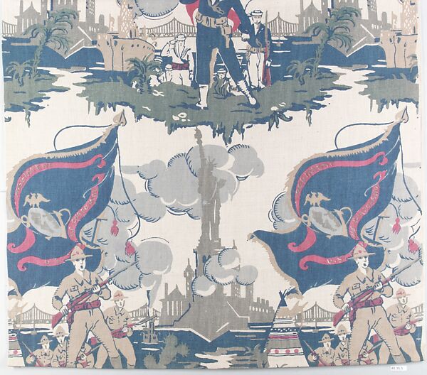 These French printed toiles, or textiles, based on traditional French printed Toiles de Jouy, were intended to boost patriotism during World War I and incorporate various nationalistic and victorious symbols with roots in ancient classicism. These motifs—wreaths and trophies of weapons for victory, the fasces for strength in numbers, Phrygian caps for freedom, cockerels for France, and Marianne (the classically dressed Athena-like figure, the personification of the French people) for reason and liberty—are rendered in a manner both up-to-date and traditional, making them topical and movingly nostalgic.