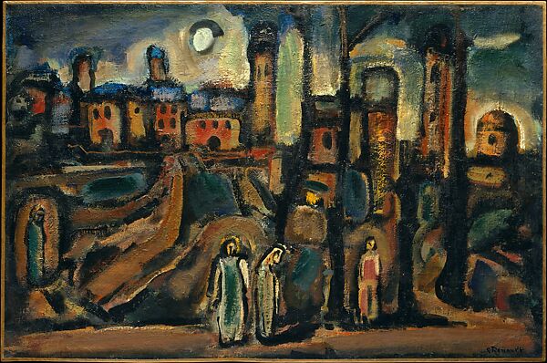 Deeply spiritual, Rouault mined his Christian faith for artistic inspiration. French poet and critic André Suarès encouraged him, writing, "never smother the mystical song that rests deep inside you." Meditating on Christian scenes, Rouault used jewel-like colors, flattened figures, and heavy black outlines in a manner suggestive of stained glass. Twilight is one of many biblical landscapes the artist completed between 1929 and 1939. Although the painting’s title does not reference a specific story, the central figures who encounter blocked doorways under a darkening sky may be Joseph and Mary seeking shelter in Bethlehem, for Mary to give birth to the infant Christ.