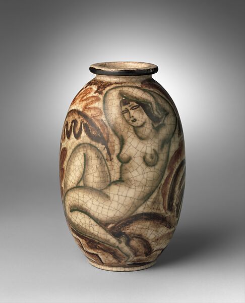 Buthaud rarely conceived his pots as utilitarian wares but rather as decorative works of art, treated as canvases in the round. The integral relationship between form and decoration can be seen in the bulbous shape of this vase and of the bodies that wrap around it. The visible cracks of the peau-de-serpent ("snakeskin") glaze are deliberate and characteristic of Buthaud’s sensuous work.