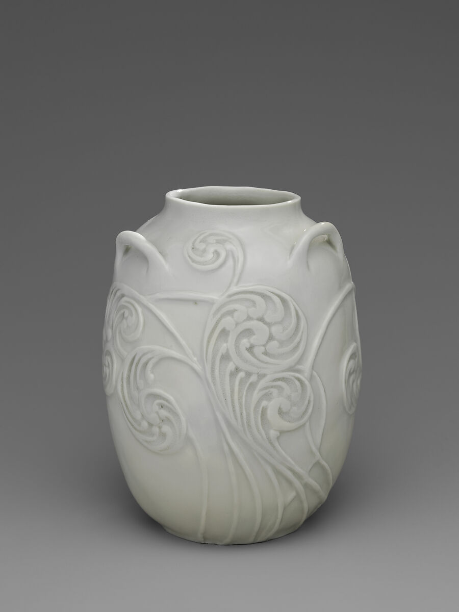 M. Louise McLaughlin was a true pioneer in the development of artistic ceramics of the late nineteenth and early twentieth centuries. In the 1870s she was one of the first in the United States to learn and disseminate that challenging medium of barbotine, a painterly mode of decorating earthenware with slip under the glaze. Similarly, in 1898, she was the first to master the difficult medium of making and decorating porcelain in a small studio, outside of a larger factory setting, when she first developed her Losanti porcelain production in a shed in her backyard in Cincinnati. Much of the decoration was painstakingly carved into the leather-hard surface before glazing and firing.