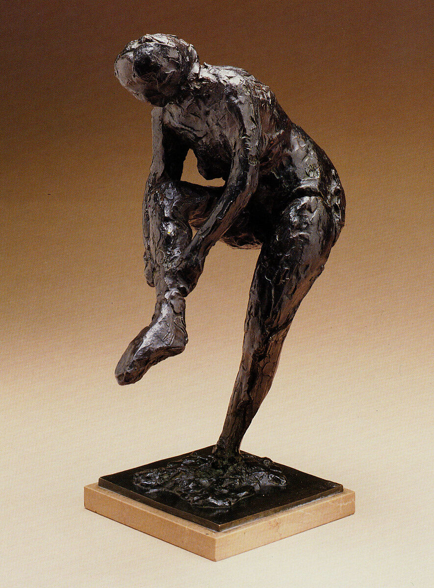 Since Degas’s surviving sculptures represent only a portion of his entire production, and since none are dated, it is difficult to establish a chronology. Those that still exist depict Degas’s favorite subjects. With the exception of a few sculpted heads, these include horses, dancers, and women—bathing or dressing—all caught in a fleeting moment. It has been suggested that, while Degas appears to have engaged adolescent models to pose for his earlier works, the later sculptures depict more mature and less slender sitters. In accordance with the artist’s expressive and summary late painting style, the surface here is rough and coarse. The face is indicated by a few flat planes, and the missing left foot either broke off from the wax model or perhaps never existed at all.