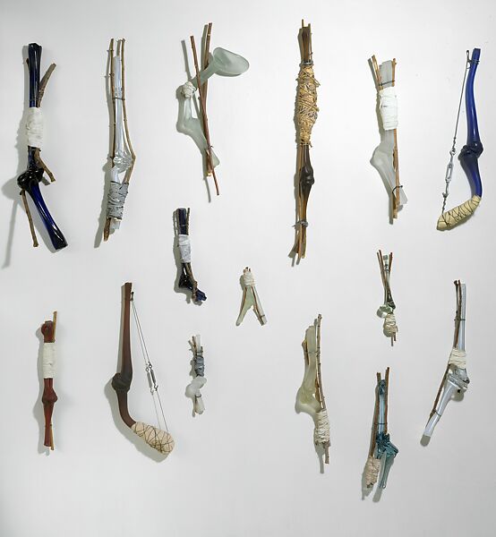 Aschenbrenner, a studio glass artist and Vietnam War veteran who sustained a leg wound while on a mission during the Tet Offensive, transforms his war experience into a series of hauntingly twisted glass bones which were blown in his studio. Each pale mangled bone is held together by cloth bandages, wire and twigs, creating a nightmarish memory of the horrors of war.
