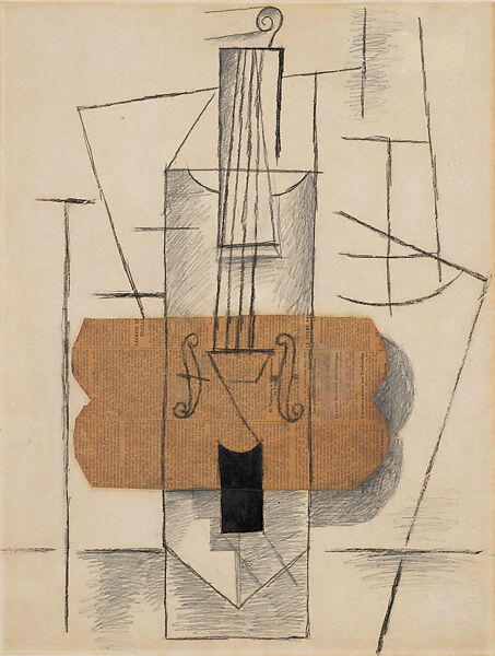 In this two-dimensional variant of one of Picasso’s paperboard-and-string constructions, the illegible newsprint laid on its side evokes the fine grain of a violin’s wood case. The map of lines surrounding the instrument, perhaps indicating where other cutouts might go, recalls the gridlike structure of many trompe l’oeil board paintings (including the nearby Harnett). To judge by the violin’s long, narrow form and pointed lower section, Picasso had a “kit” in mind. Small enough to be kept in a pocket, kit violins were used by seventeenth- and eighteenth-century dance teachers and street musicians and occasionally appear tucked behind straps in letter-rack paintings.