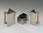 This striking geometric coffee service is an important work in the short-lived but fascinating career of Helen Hughes Dulany. Based in Chicago, she established a factory to produce her industrially inspired metal and silverware designs in 1931, only to close it permanently in 1936. This set is particular for its dramatic flat planes of unornamented stainless steel and its introduction of Bakelite, an early plastic first used in automobile and electric industries for its heat resistant qualities, into domestic homeware.