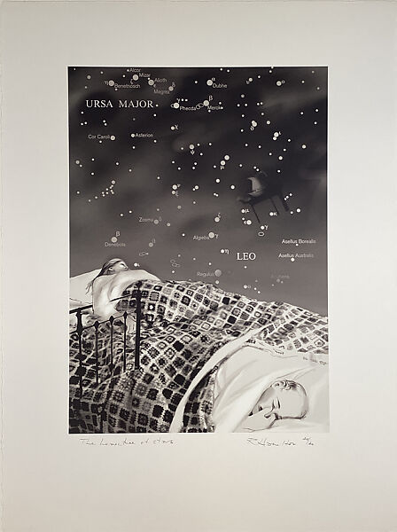 At the end of James Joyce’s Ulysses (1922), the characters Molly and Bloom drift off to sleep under “[t]he heaventree of stars hung with humid nightblue fruit.” For this print, Hamilton posed his wife, the artist Rita Donagh, and his assistant Nigel McKernaghan as the two lovers. Using Quantel Paintbox and Photoshop, Hamilton added hand-drawn lines and other details such as a bedcover crocheted by his mother. The digital technology enabled Hamilton to work entirely from his studio at Northend, a converted farm in the Oxfordshire countryside, without having to travel to printers’ workshops, as had been his habit.