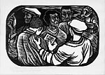 Many artists who sought social justice turned to printmaking as an effective means of informing the public and promoting change. Catlett studied printmaking in Mexico City, where the great public murals by artists such as Diego Rivera impressed on her art’s powerful social function. Depicting a female organizer and four workers (one of whom reads a printed leaflet), this linocut is a vivid testament to the struggle for labor organization and solidarity in the industrial tumult of the twentieth century. The print is one in a set of fifteen entitled The Negro Woman that Catlett created as a chronicle of the oppression, resistance, and survival of African American women.