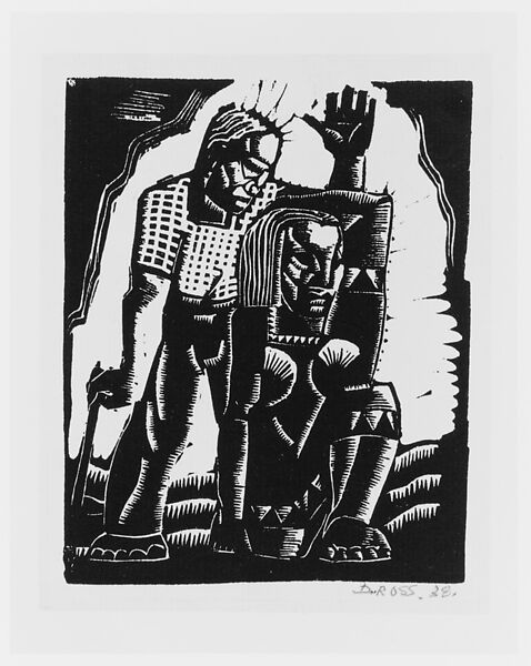 Ross was a central figure in the African American art scene in Chicago in the 1930s and 1940s. Part of the group of Black artists around painter George Neal, he helped found the South Side Community Art Center in 1940. Art historians have hypothesized that this dramatic woodcut may have been intended as a book illustration. Surrounded by a white, mountain-like form, the figures seem to grow out of the very earth below them. The woman, her breasts and hair hewn as though from rock, crouches in a sculptural pose beneath a man who stands with one arm raised and grips a farming tool in his other hand.