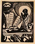 The boldness of this woodcut design may have been inspired by the German Expressionist prints Wells saw during his student years at Columbia University’s Teachers College (1924–28), and by his subsequent association with New York art dealer and print enthusiast J. B. Neumann, an early champion of German Expressionism. The young artist made his first prints in 1927, displaying a preference for relief printmaking (woodcuts and linocuts). Initially, his images were created to illustrate texts in leading African American periodicals such as The Crisis and Opportunity, but eventually he produced them as independent works of art. In this powerful example, Wells joins religious iconography and his faith in a promised land with secular symbols of oppression and temptation in American society.