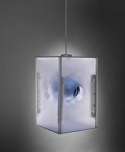 The Irish-born Gray moved to France in 1907, where she spent the rest of her life working as a designer and architect. Her early work was luxurious, expensive, and one-of-a-kind, principally made for private clients like the couturier Jacques Doucet. Between 1922 and 1930 she ran a shop in Paris called Jean Désert, where she sold her designs; during this period her aesthetic shifted from luxury to a more industrial functionalism that culminated in her spare architectural work of the 1930s. This pair of lanterns is part of a series of hanging lights she produced during the late 1920s; earlier examples were made from lacquered metal, ostrich eggs, or colored glass, while later examples like these incorporated humbler industrial materials like Perspex, painted metal, and the mirrored glass balls that serve as reflectors for concealed lightbulbs.