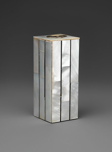 Hoffman’s simple grid showcases the marquetry of precious wood and mother-of-pearl. This candle holder belongs to a desk set (MMA 1977.72.1ab–5) that is an early example of a modernist aesthetic based on geometry rather than natural elements, a formal conceit that spanned various scales, from buildings to ink pads. The basic volumes and shapes of the set suggest mini-architecture, or an urban landscape.
