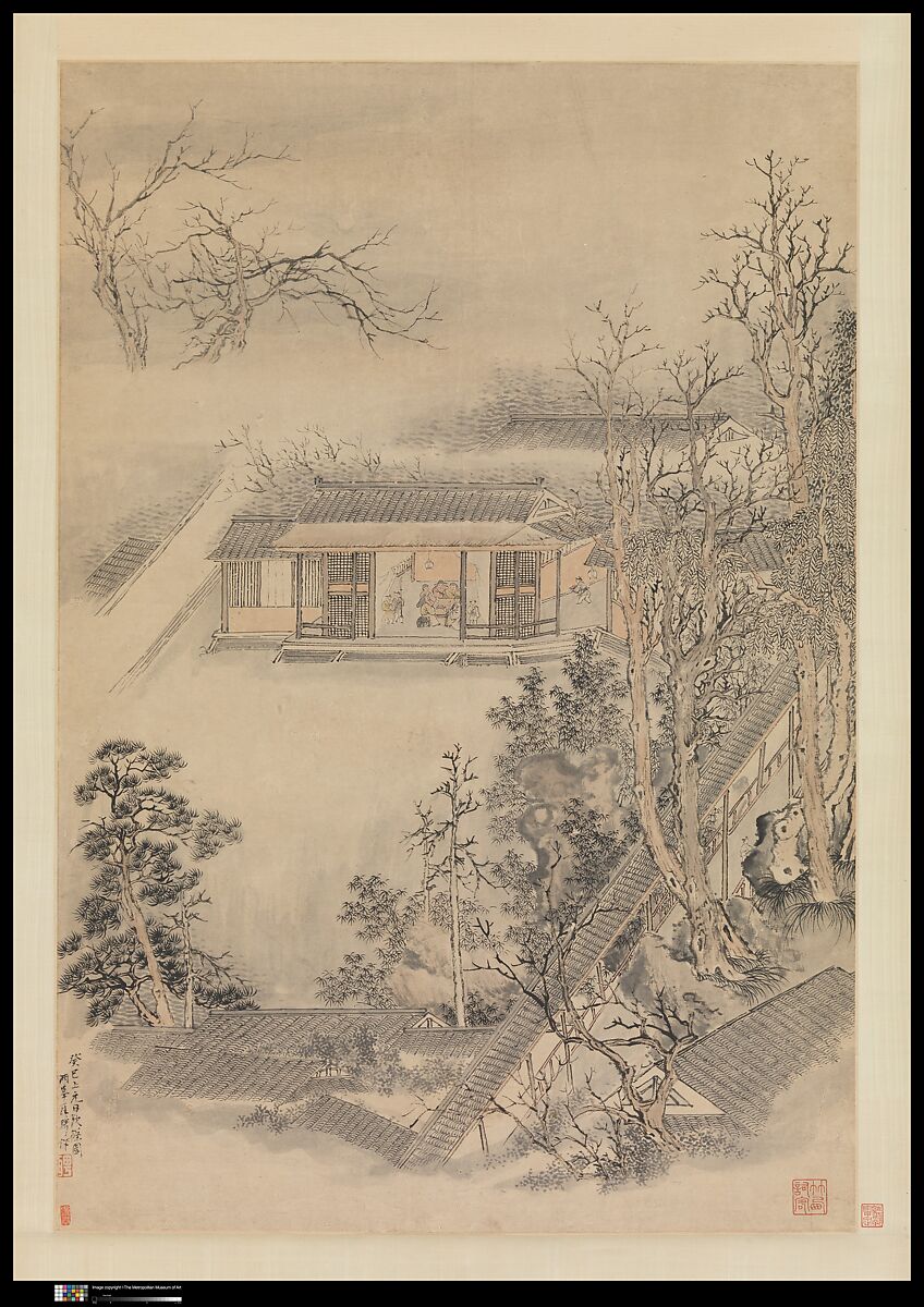 Painted at the end of Luo Ping's first Beijing sojourn, this depiction of a gathering beneath a lantern to celebrate the first full moon of the year commemorates a moment of social interaction between the artist and his patron-friends. The "Bamboo Garden" mentioned in Luo's inscription may refer to the famous Yangzhou property he had visited with his mentor, Jin Nong (1687–1763). The scene represents a nostalgic evocation of the southern metropolis—a vision his Beijing patrons would have found appealing.