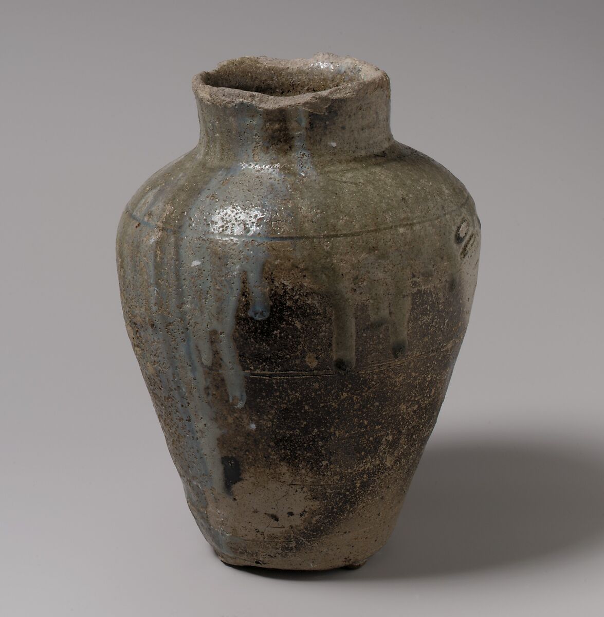 Made at Tokoname, one of Japan’s oldest pottery centers, this jar was coil-built and then smoothed on a wheel, a process that inspired its regionally distinctive embellishment of three lightly incised rings. Colors ranging from pale blue to vernal green cloak thick layers of kiln-fused ash glaze. Buried sometime in the late Heian period, this jar protected a bronze cylinder containing precious Buddhist sutras and relics.