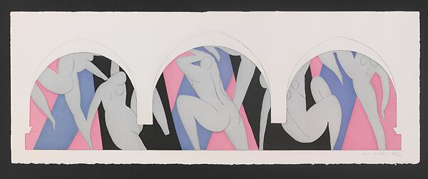 This print depicts Matisse’s major mural composition Dance, commissioned in autumn 1930 by the renowned American collector Dr. Albert C. Barnes, of Merion, Pennsylvania. Barnes, who began collecting Matisse’s work in 1912, had by 1930 amassed the largest and most significant group of the artist’s oils, watercolors, gouaches, and sculpture in America. He wanted as the “crown jewel” of the collection a large mural for the two-story paintings gallery in his mansion.