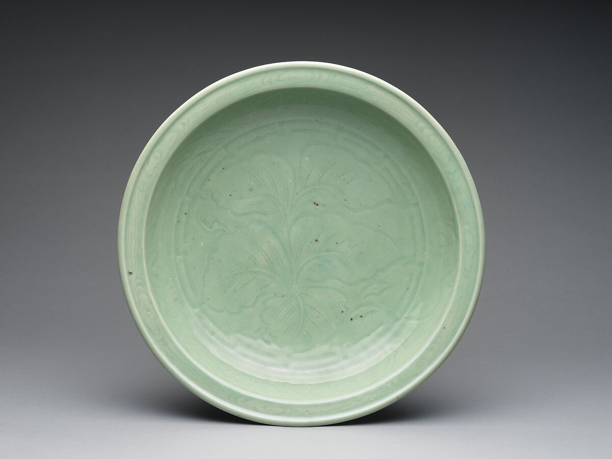 This large dish, an early Hizen ware excavated from the Maruo kiln site in western Arita, is an important example of large-scale celadon production in Japan. Although few complete celadon pieces survive, shards have been uncovered at more than twenty-two kiln sites across the region, suggesting a broader industry. These wares were likely made for export to Southeast Asia, where numerous comparable dishes have been discovered. They appear to have been crafted to meet a demand previously satisfied by celadons from China’s Longquan kilns. When exports of Chinese ceramics declined sharply in the 1650s, kilns at Arita and Hasami, in Nagasaki Prefecture, responded by mass-producing celadon dishes, patterned using chisels or pressure molds.