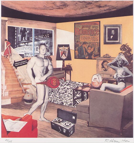 This print is based on a small collage from 1956 that Hamilton made for “This is Tomorrow,” an exhibition of the Independent Group at the Whitechapel Art Gallery in London. An icon of early British Pop art, the densely composed collage teems with images clipped from magazines according to the artist’s prescribed inventory: Man, Woman, Humanity, History, Food, Newspapers, Cinema, TV, Telephone, Comics (picture information), Words (textual information), Tape recording (aural information), Cars, Domestic Appliances, and Space. In 2004, after further advances in ink-jet printing, Hamilton made an “upgraded” version of this print on an Apple Macintosh (MMA 2004.527).