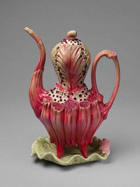 Evoking the naturalistic forms of mid-eighteenth-century British ceramics, Seeman's coffeepot appears nostalgic and perhaps even retrograde. Yet upon closer examination, forms that look like rhubarb and cabbage leaves actually represent human tissue. When the top is removed, the underside reveals white pulp and seeds reminiscent of pomegranate that can also be read as bone and red corpuscles—familiar forms that attract then repulse.