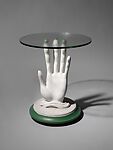 Little is known about the designer of this table, which is both a functional piece of furniture and a fantastical Surrealist sculpture. The glass tabletop rests improbably atop small balls balanced on the tips of three delicately tapering fingers, generating a sensation of tension and unease. Disembodied hands and gloves are recurrent motifs in Surrealist art, with the left hand, in particular, symbolizing the irrational. The cloudlike element from which the hand emerges also suggests a transition from the conscious to the subconscious world.