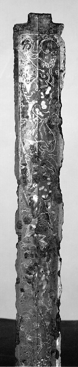 The gold and silver wire inlays on this blade depict animals moving through a stylized landscape. As in Han painting, naturalistic forms are reduced to quintessential linear expressions that vividly convey a sense of life and motion.