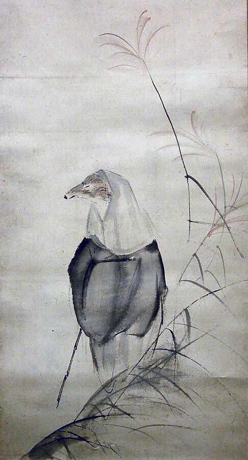 This lightly brushed image of a fox garbed as a Buddhist nun acquires a clever, perhaps personal dimension in the poem that the nun Rengetsu inscribed in her much-admired script. The delicate vivacity of its classic style well suits her vision of a long-standing superstition holding that foxes transform themselves into human form to bewitch the unwary, particularly at twilight.