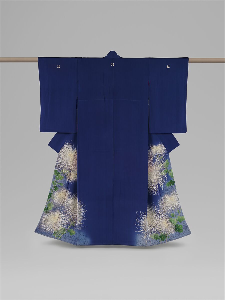 The 1920s witnessed the rise in Japan of associations of amateur chrysanthemum enthusiasts, and a stand of spectacular chrysanthemums commands the bottom of this kimono, with their slender petals curving dynamically upward against the rich blue ground. On the outer robe, the leaves are embroidered with couched gold metallic threads in circular details that may represent dewdrops and the family crest is resist dyed in white in five places. On the inner robe, the lower section echoes the chrysanthemum pattern of the outer robe both inside and out. The upper section is stitch-resist dyed on plain-weave silk with diagonal bands alternating turquoise and red, each with an incomplete geometric pattern of stylized hemp leaves (asa-no-ha). The vivid colors and the painterly execution of the pattern are characteristic of the Taishō period. A bride wore this kimono ensemble on her wedding day in 1923.