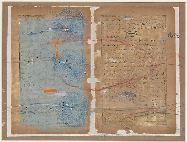 - Medium: Collage of paper (manuscript pages) with black and blue inks, gouache, watercolor, graphite, and metallic paint, with dry transfer (Letraset) on Wasli paper