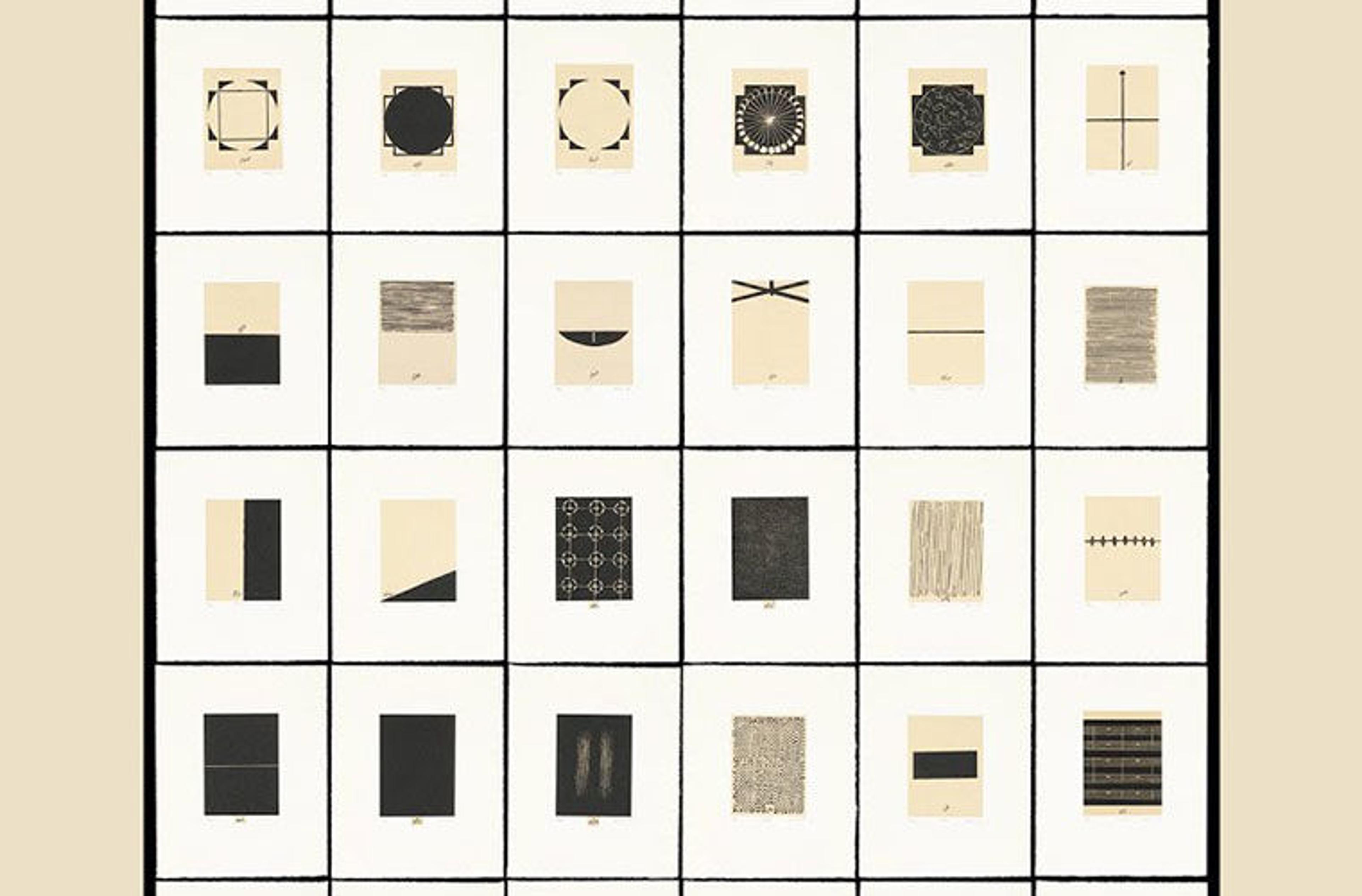 This suite of thirty-six woodcut prints is one of Zarina’s most ambitious series, weaving together many of the artist’s enduring conceptual preoccupations, while presenting key engagements with modernism and minimalism in its reduced palette and spare aesthetic. Each sheet in the portfolio has an abstract image plus a word written in Urdu, the artist's mother tongue. The carefully chosen words and accompanying spare graphics together culminate as a poignant work that evokes recollections of place, language, and home—from the areas of a physical space to the experience of weather in a particular place to the cosmic phenomena that mark the passage of time.